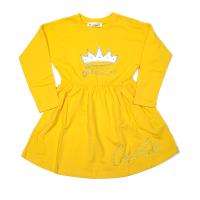 Платье для девочки с принтом"принцесса" из парчи и страз. Горловина на тонком манжете. Заниженная пройма рукава. Отрезное по талии. Юбка со сборкой по талии. На юбке надпись из страз.Размер 110: длина- 57 см, обхват груди- 62 см, длина рукава- 32 см.