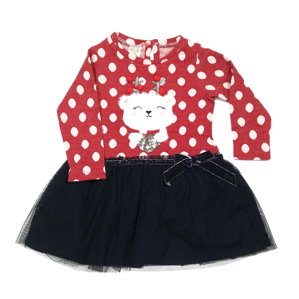 Платье для девочки, утепленное, из эластичного футера с начесом, с красочным принтом-вышивкой "мишка" из вел-софта, украшенного пайетками. Горловина на трикотажном манжете. Застежка пуговица на спинке. Отрезное по талии. Юбочка со сборкой по талии, с верхним слоем из фатина, украшена бантиком из бархата.Размер 92: длина- 46 см, обхват груди- 54 см, длина рукава 29 см.