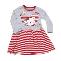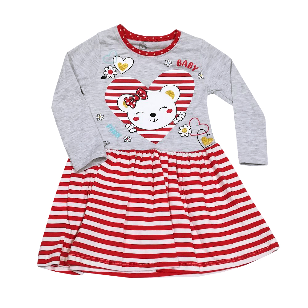 Платье для девочки, из эластичного, х/б трикотажа, с красочным принтом на груди. Горловина на манжете из трикотажа в горошек. Отрезное по талии. Юбочка из трикотажа в полоску, со сборкой по талии.Размер 92: длина- 48 см, обхват талии- 50 см, длина рукава- 31 см.