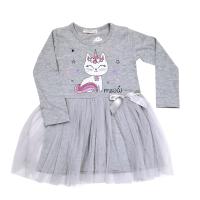 Платье с красочным принтом "кошечка-единорог", украшенным блестящими красками. Горловина отделана трикотажным кантом. Отрезное по талии. На талии атласный бантик. Юбочка из трикотажа дополнена верхней юбочкой из фатина, со сборкой по талии.