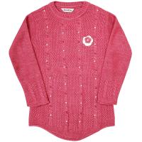 Вязаный джемпер удлиненный для девочки. Фактурный узор "коса" украшает манжеты и переднюю половинку изделия, которая также расшита бусинами. Низ изделия закругленной формы.Размер 128: длина 60 см, обхват груди 76 см, длина рукава по внутреннему шву 46 см.