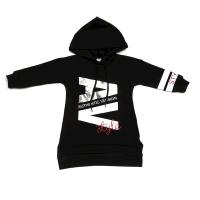 Джемпер с капюшоном для девочки, удлиненный, утепленный, из футера с начесом. Прямой крой, заниженная пройма, спущенное плечо. На полочке яркий принт. Капюшон со шнурком. Рукав, низ джемпера на манжетах. На одном рукаве надпись и полоски. Спинка немного длиннее полочки. По бокам, снизу, разрезы.Размер 92: длина- 48 см, обхват груди- 59 см, длина рукава- 23 см.