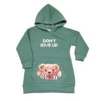 Худи с капюшоном для девочки, удлиненное, утепленное, из х/б футера с начесом. Прямой крой, заниженная пройма, спущенное плечо. Рукав, низ худи на трикотажных манжетах. На груди надпись. Карман-кенгуру украшен термо-принтом "мишка".Размер 110: длина- 53 см, обхват груди- 66 см, длина рукава- 28 см.