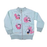 Мастерка для девочки, утепленная, из эластичного х/б футера с начесом. Украшена красочным принтом "пингвинчики", украшенном стразами. Рукав, горловина, низ мастерки на трикотажных манжетах.Размер 86: длина 37 см, обхват груди 60 см, длина рукава 33 см.