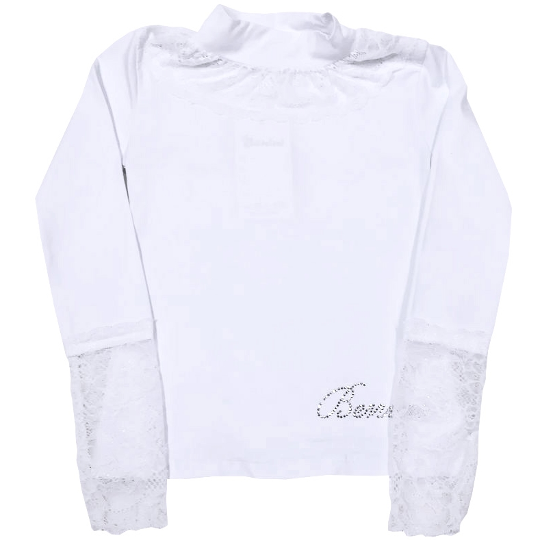 Водолазка для девочки из эластичного трикотажа. Полуприлегающий силуэт. Воротник-стойка. Вставка у горловины и манжет рукава из эластичного гипюра. Снизу надпись из страз.Размер 116: длина- 42 см, обхват груди- 56 см, длина рукава- 46 см.