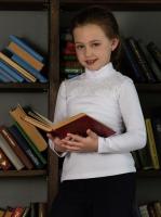 Джемпер для девочки, из эластичного, х/б трикотажа. Полуприлегающий силуэт. Длинный рукав. Воротник- стойка. Украшен на груди эластичным кружевом.