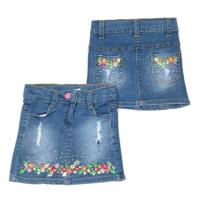 Юбка джинсовая,  прямого кроя, с декоративными надрезами и вышивкой цветов по низу юбки, украшенной стразами. На поясе со шлевками для ремешка, сзади на кокетке. На поясе, с внутренней  стороны спинки, вшита резинка и пуговицы для регулирования резинки. Ширинка с застежкой молния и яркой пуговицей на поясе. Два боковых  прорезных кармана,  Сзади два накладных кармана с декоративными потертостями и вышивкой цветов.