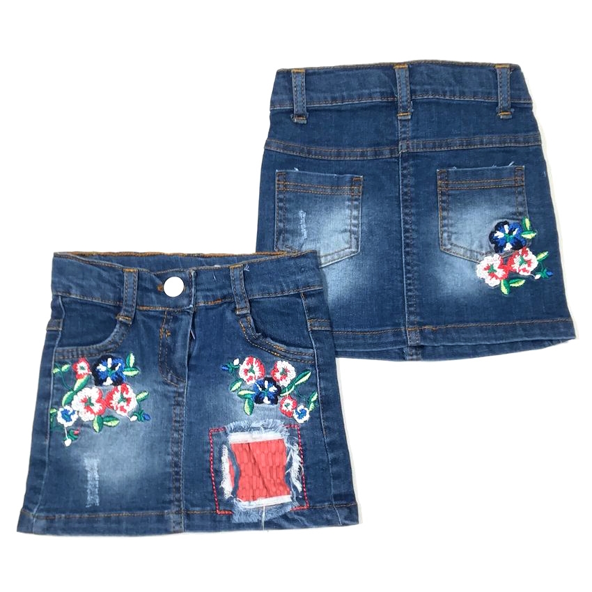 Юбка джинсовая,  прямого кроя, с декоративными надрезамии , вставками ткани с рельефным рисунком под ними и вышивкой цветов. На поясе со шлевками для ремешка, сзади на кокетке. На поясе, с внутренней  стороны спинки, вшита резинка и пуговицы для регулирования резинки. Ширинка с застежкой молния и пуговицей на поясе. Два боковых  прорезных кармана,  Сзади два накладных кармана, на одном декоративные потертости, на другом вышивка цветов.