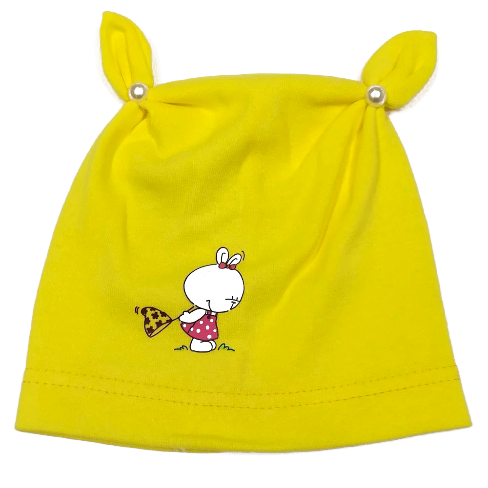 Шапочка однослойная, с подгибом. Ушки шапочки связаны. Модель украшена термотрансфером "зайчик" и полужемчугом.