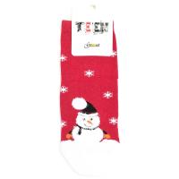 Детские трикотажные носки с тканым зимним рисунком "Снежинки" по всей длине изделия. Паголенок средней высоты. Оригинальный мысок модели с рисунком "Снеговик", рисунок снеговик вывязан фасонной пряжей травка. Пятка и мысок контрастных цветов.