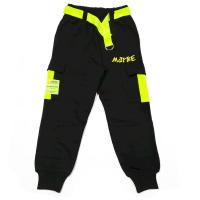 Штаны из эластичного х/б трикотажа. Снизу на манжетах, в поясе на закрытой резинке. Пояс со шлевками и ремешком из яркой смесовой ленты с металлическими полукольцами для регулирования. Два боковых, прорезных кармана. На штанинах два боковых накладных кармана с клапанами, вставками из яркого трикотажа, и нашивкой с надписями на одном кармане. На одной штанине надпись-термотрансфер.