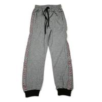 Штаны для мальчика на манжетах, на резинке и шнуровке в поясе. Боковые прорезные карманы с манжетами. По бокам ломпасы из полосатой ткани с надписями.Размер 140: длина 82 см, обхват талии 54-60 см.