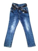 Джинсы для мальчика. Зауженный крой, с декоративными потертостями, на пояске со шлевками, и ремнем из иск. кожи. На пояске, со стороны спинки, с внутренней стороны, вшита резинка и пуговицы для регулирования резинки. Ширинка с застежкой молния и пуговицей на поясе. Два боковых прорезных кармана с клепками и один мини-карманчик с вышитой надписью спереди. Сзади два накладных кармана с рельефами и вышитой надписью. На поясе, сзади, фирменная нашивка из иск.кожи.Размер 116: длина 65 см, обхват талии 50-56 см.