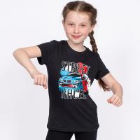 Футболка прямого силуэта, с втачным коротким рукавом. Передняя половинка декорирована гоночным принтом с надписью, переводится как "Уличный гонщик". Вырез горловины круглый, форма выреза связана трикотажной эластичной резинкой. Горловина спинки внутри обработана настрочной планкой из кулирки. Низ изделия и рукавов подвернут и прострочен двойной строчкой.Размер 104: длина- 42 см, обхват груди- 67 см.