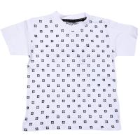 Футболка для мальчика. Горловина на манжете. Полочка с принтом "квадратики", спинка однотонная. На полочке объемная надпись.Рост 110 см, длина- 42 см, обхват груди- 64 см.