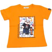 Футболка для мальчика, из х/б трикотажа, с ярким, пришивным принтом " мишка со скейтом" из трикотажа. Короткий рукав. Декоративная нашивка на одном рукаве. Горловина на трикотажном манжете.Размер 110: длина 40 см, обхват груди 64 см.