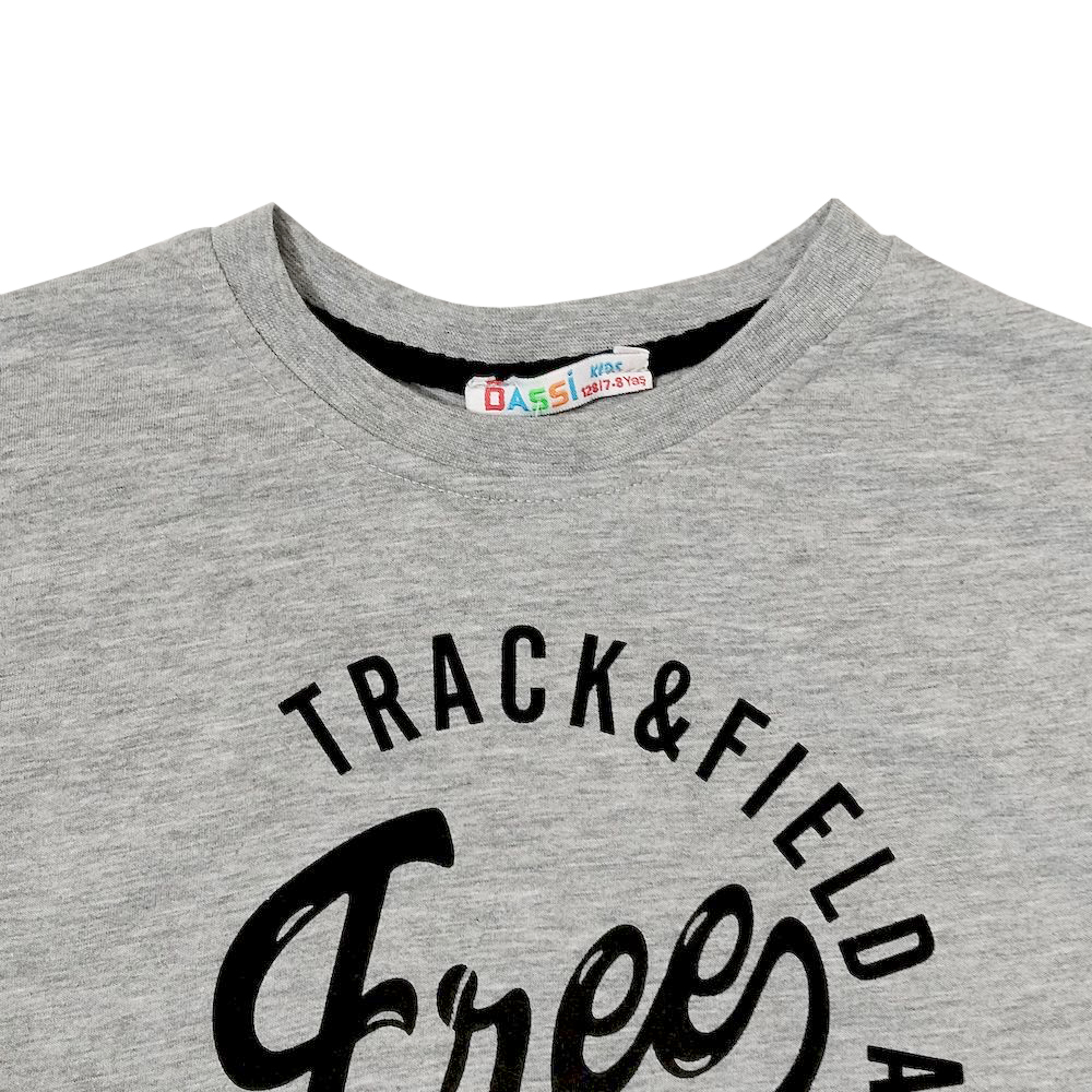 Футболка для мальчика прямого силуэта, с втачным коротким рукавом. На полочке принт c надписью на английском языке "Легкоатлетический дивизион". Круглый вырез горловины с трикотажной резинкой нежно обрамляет шею. Горловина спинки внутри обработана настрочной планкой из киперной ленты контрастного цвета. Низ изделия и рукавов обработан швом вподгибку двойной строчкой.Размер 128: длина- 48 см, обхват груди- 79 см.