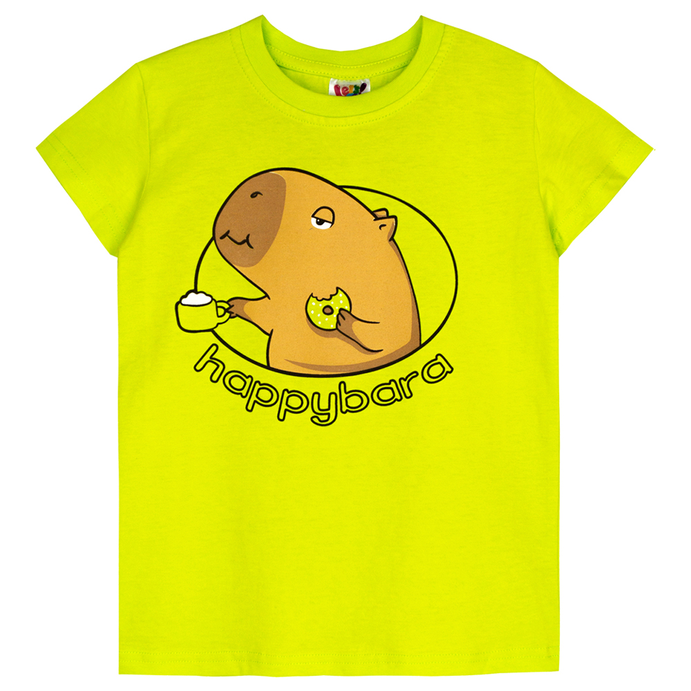 Футболка детская прямого силуэта, с втачным коротким рукавом. Передняя половинка декорирована принтом "Капибара". Вырез горловины круглый, форма выреза связана трикотажной эластичной резинкой. Горловина спинки внутри обработана настрочной планкой из кулирки. Низ изделия и рукавов обработан швом вподгибку двойной строчкой.Размер 98: длина- 42 см, обхват груди- 60 см.