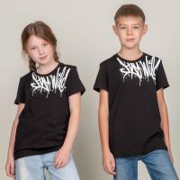 Футболка свободного кроя из х/б трикотажа (кулирка). На полочке принт-надпись на английском языке. Круглая горловина из эластичного трикотажного материала, спинка внутри укреплена настрочной планкой. Втачной короткий рукав. Низ изделия и рукавов обработан швом вподгибку двойной строчкой.Размер 134: длина 54 см, обхват груди 78 см.