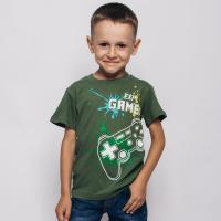 Футболка для мальчика прямого силуэта, с втачным коротким рукавом. Полочка украшена надписью "Опытный игрок" и принтом "Джойстик". Горловина круглая обработана воротником из рибаны, в цвет изделия. Горловина спинки внутри обработана настрочной планкой из кулирки. Низ изделия и рукавов обработан швом вподгибку двойной строчкой.Размер 104: длина- 40 см, обхват груди- 64 см.
