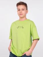 Футболка для мальчика свободного силуэта (оверсайз) с коротким рукавом. Горловина круглая, обработана обтачкой горловиной  из рибаны. Низ изделия и рукава обработаны швом вподгибку. На полочке принт шелкография в виде надписи (перевод "Волна высокая и большая").
