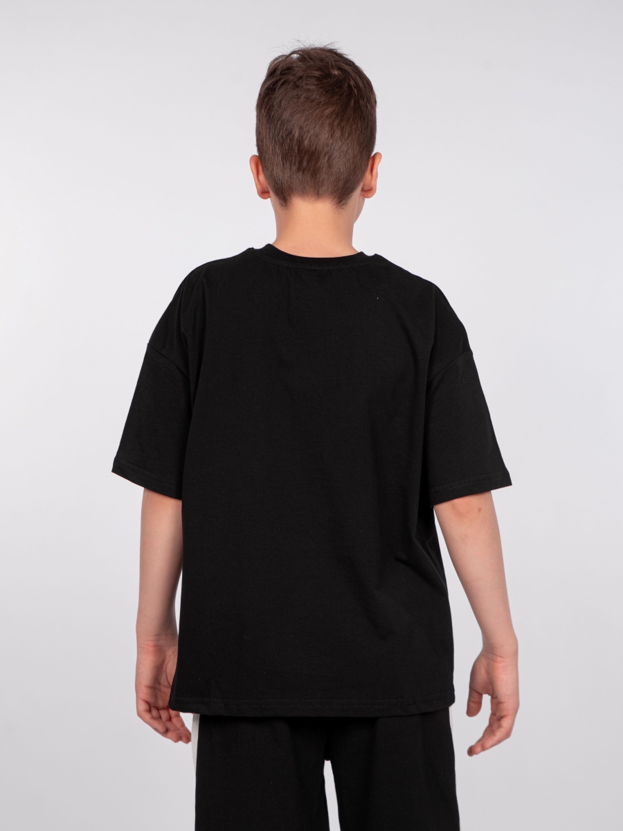 Футболка для мальчика свободного силуэта (оверсайз) с коротким рукавом. Горловина круглая, обработана обтачкой горловиной из рибаны. Низ изделия и рукава обработаны швом вподгибку. На полочке принт шелкография в виде надписи (перевод "Волна высокая и большая").Размер 134: длина - 55 см, обхват груди - 94 см.