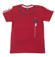 Футболка для мальчика из эластичного х/б трикотажа (кулирное полотно). Модель прямого кроя. Полочка декорирована надписями и рисунком-эмблемой. Горловина круглая обработана воротником из рибаны. Горловина спинки внутри укреплена настрочной планкой из кулирки контрастного цвета. Рукав короткий втачной, украшен термо-надписями. Низ изделия и рукавов обработан швом вподгибку двойной строчкой.Размер 110: длина- 44 см, обхват груди- 62 см.