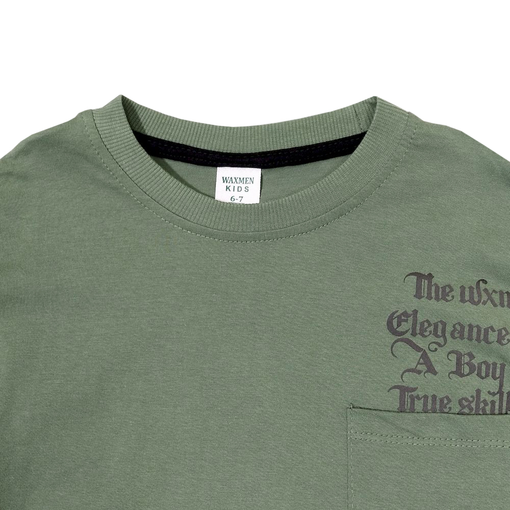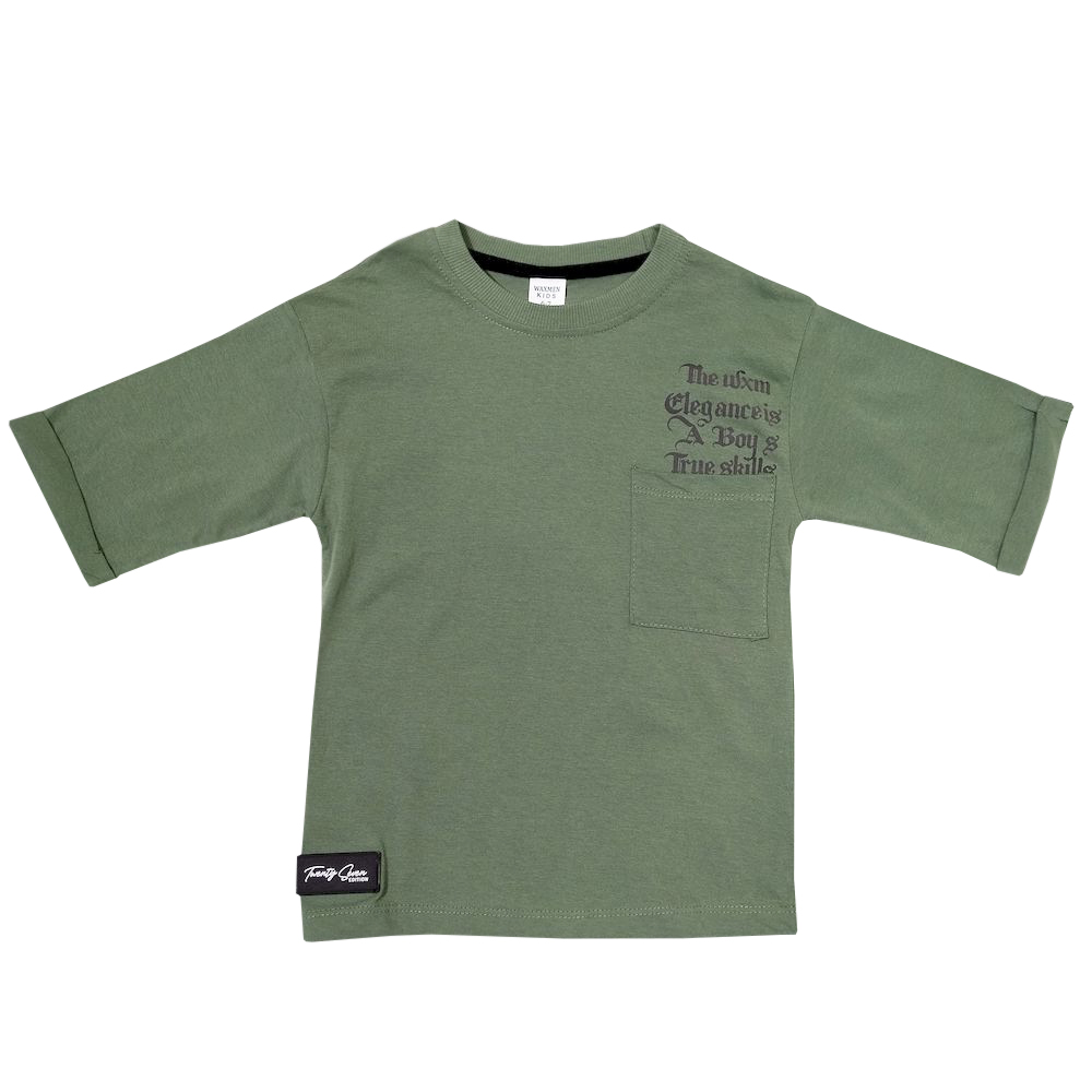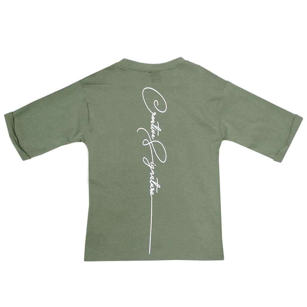 Футболка для мальчика прямого силуэта. Выполнена из хлопкового трикотажа кулирное полотно. Передняя половинка декорирована нашивкой и надписями на английском языке. Круглый вырез горловины с трикотажной резинкой в рубчик нежно обрамляет шею. Горловина спинки внутри обработана настрочной планкой из кулирки контрастного цвета. На груди расположен один накладной карман. Рукав три четверти со спущенной линией плеча, низ рукавов подвернут. Cпинка украшена творческой подписью на английском языке "creative signature". Низ изделия обработан швом в подгибку двойной строчкой.Размер 140: длина- 57 см, обхват груди- 82 см, длина рукава 23 см.