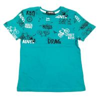 Футболка для мальчика, из х/б трикотажа, с яркими, черными и неоновыми надписями и рисунками на полочке и рукавах. Горловина на трикотажном манжете. Короткий рукав.Размер 110: длина- 42 см, обхват груди- 60 см.