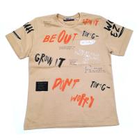 Футболка для мальчика, из х/б трикотажа,  с крупными надписями на полочке и рукавах и квадратной нашивкой из трикотажа. Горловина на тонком, трикотажном манжете. Короткий рукав с отворотом.