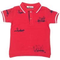 Футболка-поло для мальчика. Воротник из эластичного трикотажа. Планка с застежкой на пуговицы. Рукав на манжете. Спинка удлиненная на 2,5 см. На полочке и рукавах рисунки.Размер 98: длина- 38 см, обхват груди- 58 см.