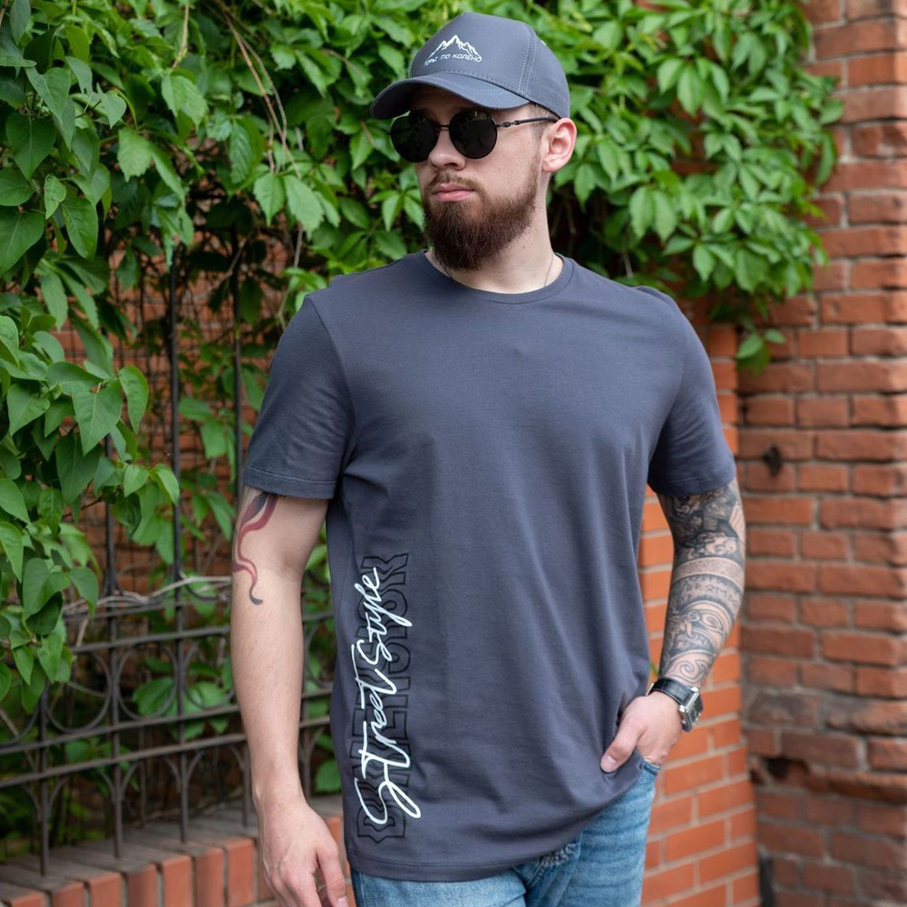 Футболка мужская прямого силуэта, с втачным коротким рукавом. Передняя половинка декорирована надписью на английском языке "Street style". Вырез горловины круглый, форма выреза связана трикотажной эластичной резинкой. Горловина спинки внутри обработана настрочной планкой из кулирки. Низ изделия и рукавов подвернут и прострочен двойной строчкой.Размер 48: длина- 74 см, обхват груди- 106 см.