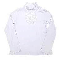 Джемпер для девочки, из эластичного трикотажа. Полуприлегающий силуэт. Длинный рукав. Воротник- стойка спереди присобрана. Украшена на груди эластичным кружевом.Размер 122: длина- 44 см, обхват груди- 56 см, длина рукава- 42 см.