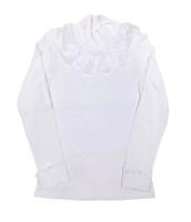 Джемпер для девочки, из эластичного, х/б трикотажа. Полуприлегающий силуэт. Длинный рукав с отворотом. Воротник- стойка, украшен на полочке рюшей из эластичного кружева.Размер 122: длина- 43 см, обхват груди- 60 см, длина рукава- 40 см.