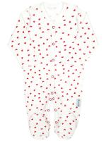 Комбинезон свободного кроя для новорожденных малышей. Декорирован принтом "Сердечки". Выполнен из фактурного трикотажного полотна (интерлок). Модель с закрытыми носочками. Горловина, планка обработаны трикотажным кантом из основного полотна. Длинный втачной рукав, низ рукавов подвернут и прострочен двойной строчкой. Застёжка комбинезона выполнена в виде удобных кнопок по центру, по всей длине туловища, и по штанишкам. Штанишки с ластовицей. С лицевой стороны в боковом шве вшивной элемент. У размеров 50 и 56 низ рукавов закрыт варежками - антицарапками. У размера 56 рукав-реглан.Размер 50: длина - 43 см, обхват груди - 37 см, длина рукава (с учетом рукавички) - 20 см (без рукавички 16 см).