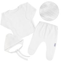 Комплект однотонный для новорожденных, состоящий из распашонки, ползунков и чепчика. Выполнен из перфорированного х/б трикотажа (интерлок). Распашонка с запахом. Рукав с варежкой антицарапкой. Застежка кнопки снаружи с левой стороны, изнутри с правой стороны. Наружные швы.Ползунки прямого кроя. В поясе на закрытой резинке. Наружные швы.