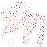 Комплект для новорожденных, состоящий из распашонки, ползунков и чепчика. Выполнен из фактурного х/б трикотажа (интерлок) с мелким принтом "Сердечки". Распашонка с запахом. Рукав с варежкой антицарапкой. Застежка кнопки снаружи с левой стороны, изнутри с правой стороны. Наружные швы.Ползунки прямого кроя. В поясе на закрытой резинке. Наружные швы.
