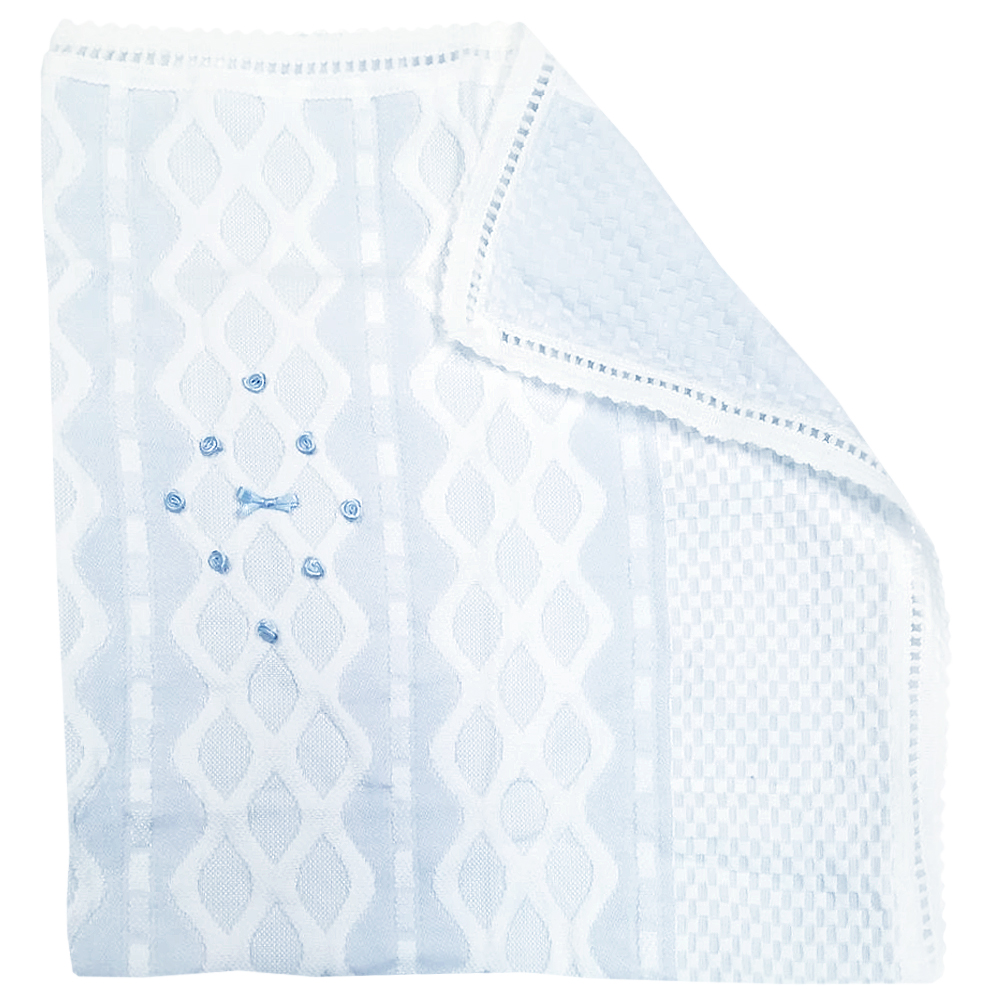 Плед с тканым рельефным рисунком. Украшен декоративными элементами: цветочками, бантиком из атласной тонкой ленточки. Края пледа обработаны вязаной декоративной тесьмой.Размер: 79*93