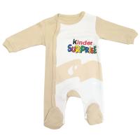 Комбинезон свободного кроя. Полочка украшена надписью "Kinder Surprise". Горловина и планка обработаны трикотажным кантом. Застёжка кнопки по правой стороне, по всей длине. Рукав длинный, втачной на манжете из основного полотна. Штанишки с ластовицей. Модель с закрытыми носочками.Размер 62: длина- 48 см, обхват груди- 48 см, длина рукава- 19 см.