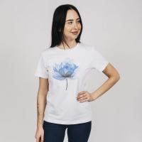 Футболка женская с втачным коротким рукавом. Выполнена из хлопкового трикотажа кулирное полотно. Прямого силуэта. Передняя половинка декорирована рисунком - "Голубая нимфея". Круглый вырез горловины с трикотажной резинкой нежно обрамляет шею. Горловина спинки внутри обработана настрочной планкой из кулирки. Низ изделия и рукавов обработан швом вподгибку двойной строчкой.Размер 44: длина 62 см, обхват груди 94 см.