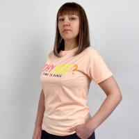 Футболка женская, прямого кроя, с ярким принтом - надписью из пайеток на груди. Горловина на тонком манжете, с внутренней отделкой трикотажным кантом на спинке.Размер (XS): длина- 55 см, обхват груди- 82 см.